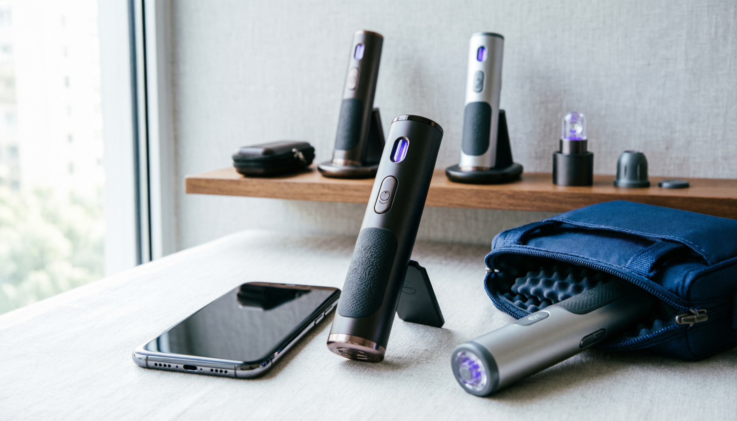 UV-C sanitizing wands kill germs on phones and travel surfaces without moisture or chemicals.